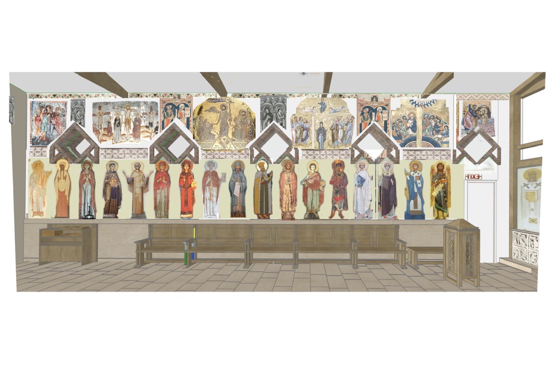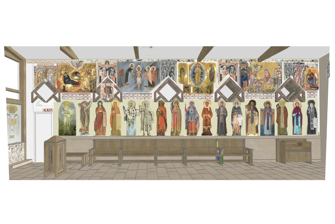 Les murs de la nef et du narthex accueilleront le registre des saints représentés debout, composé principalement de 34 saints : hiérarques, martyrs, vénérables moines et moniales.