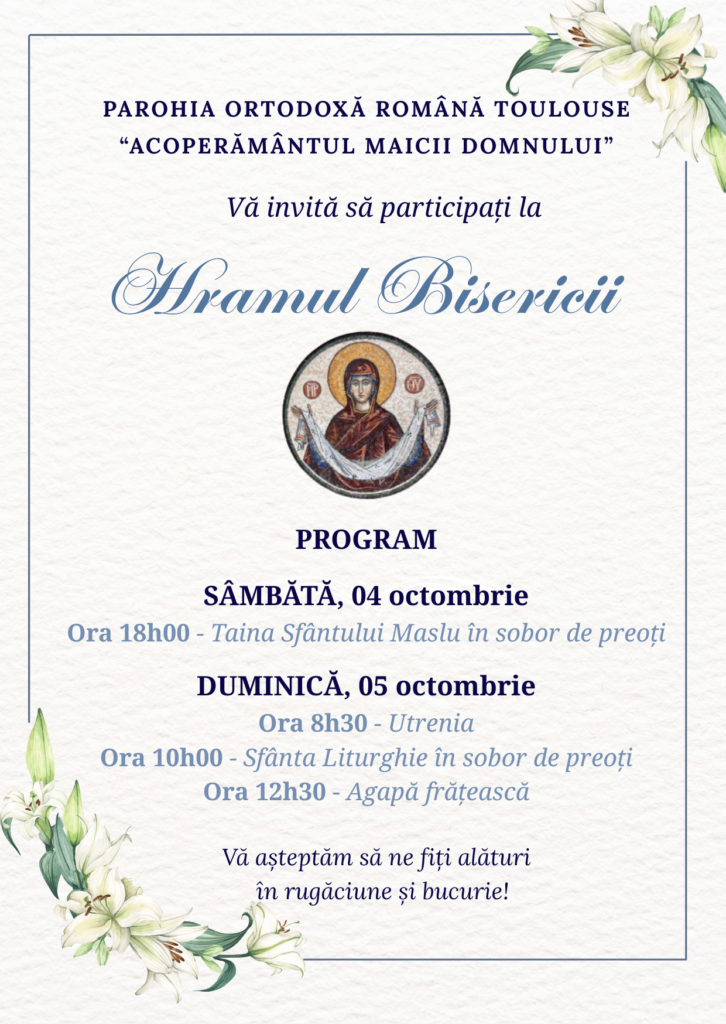 Parohia Ortodoxă Română „Acoperământul Maicii Domnului” din Toulouse vă invită cu drag să luați parte la Hramul bisericii.